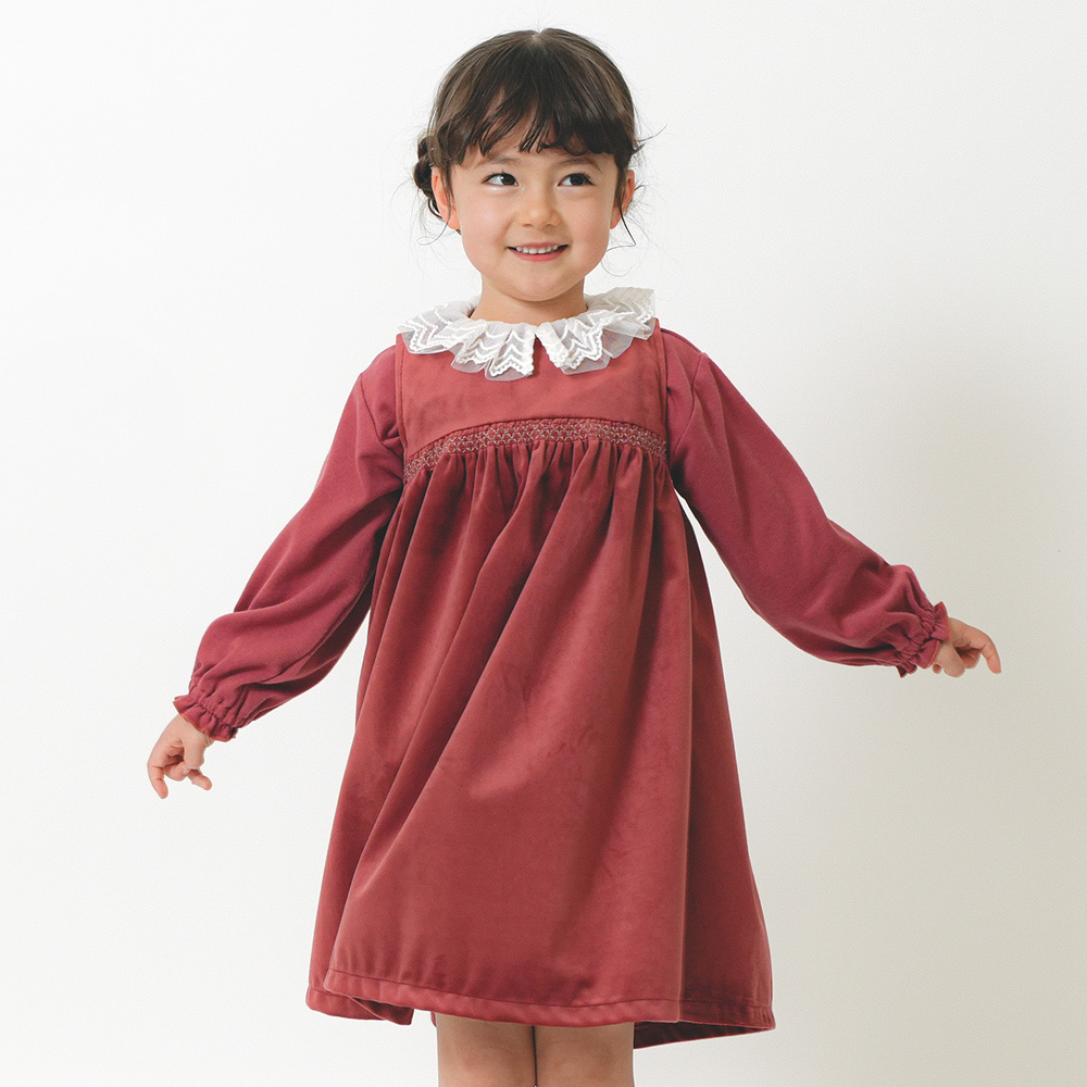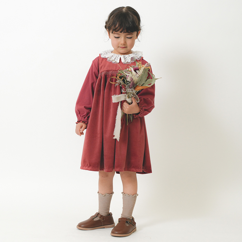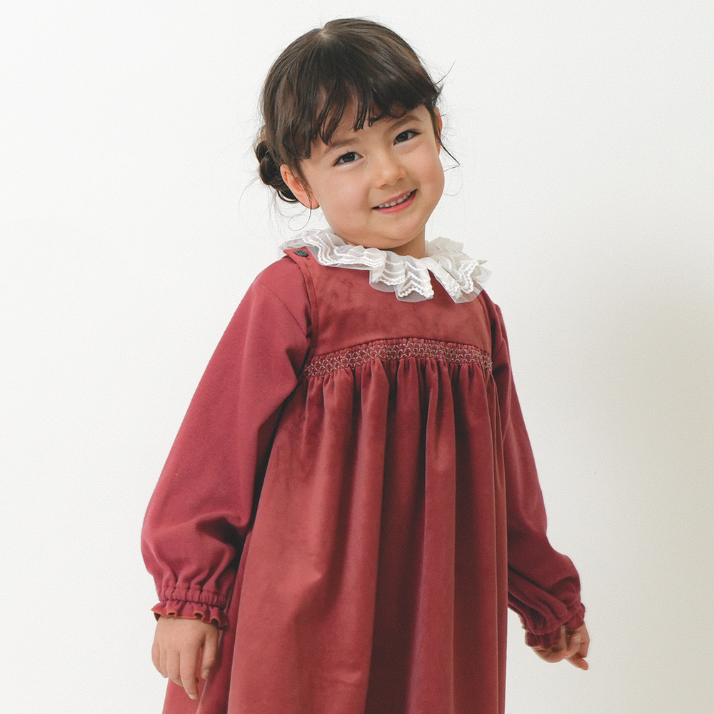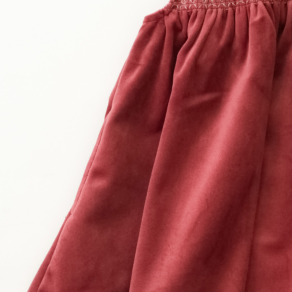 ギャザーたっぷりシルエットでスモッキング刺繍が特徴のベロアジャンスカ。