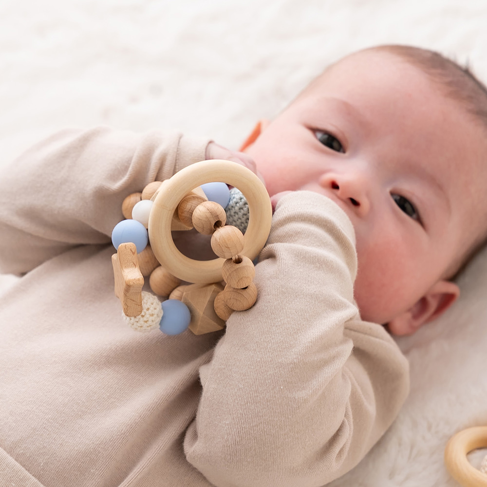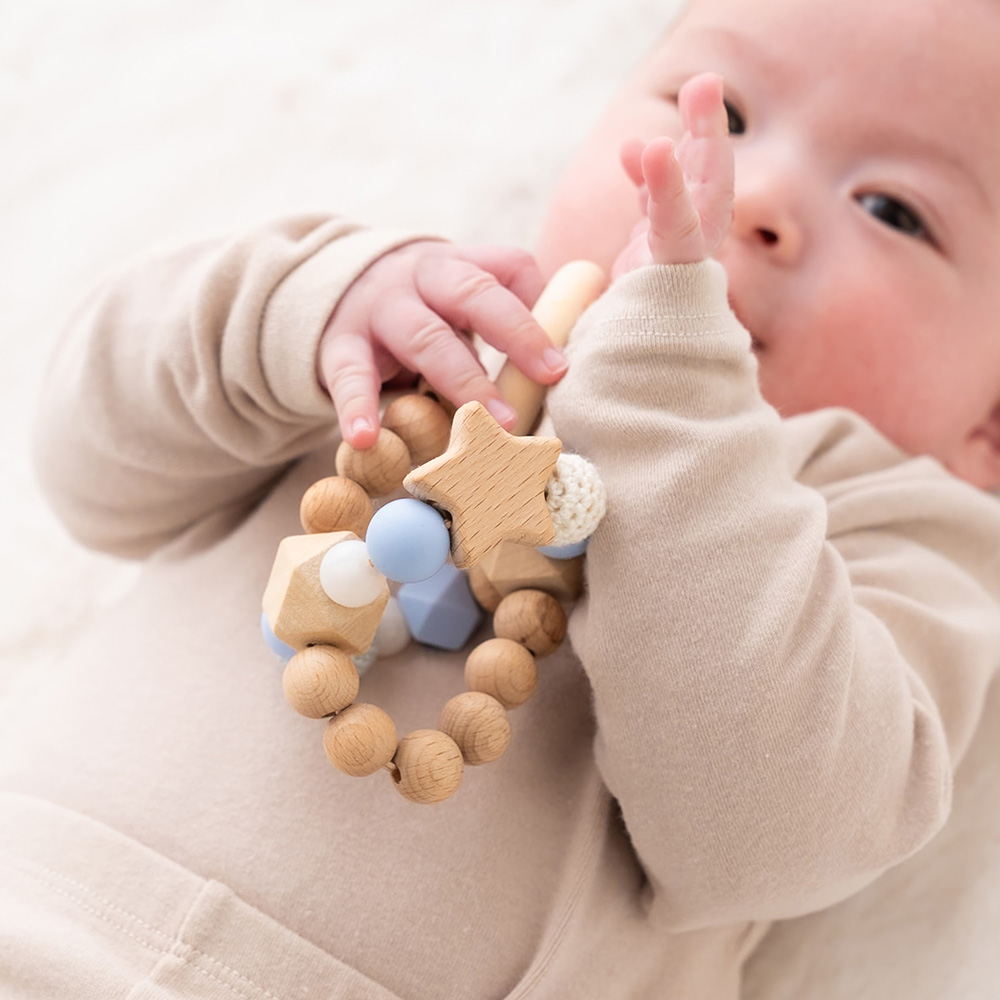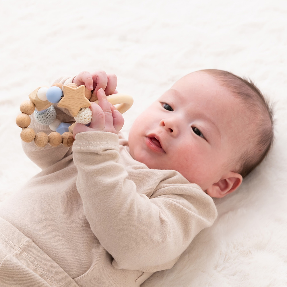 歯固めとしてだけでなく、ボールのように転がす動作が増える2歳ごろまでお使いいただけます。握る、掴む、噛むなどの赤ちゃんの発育発達を促すおもちゃです。