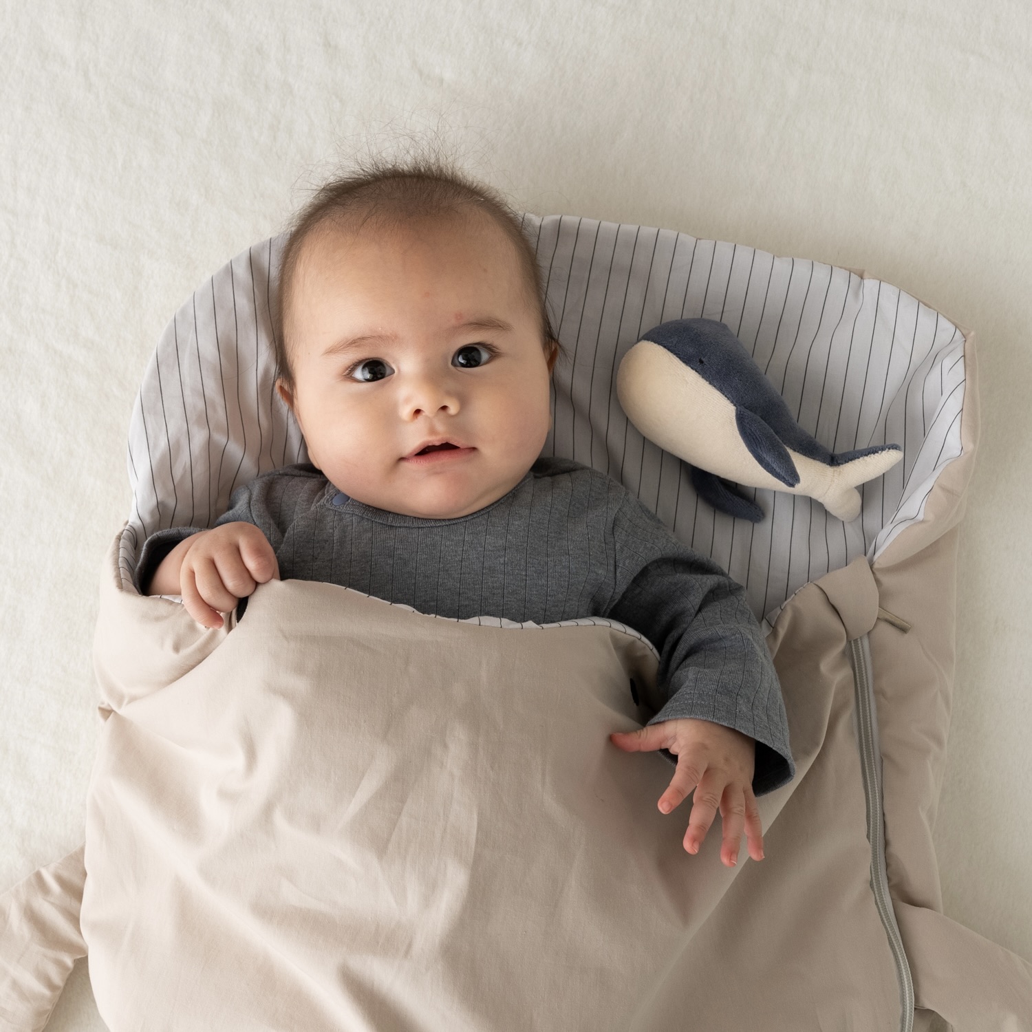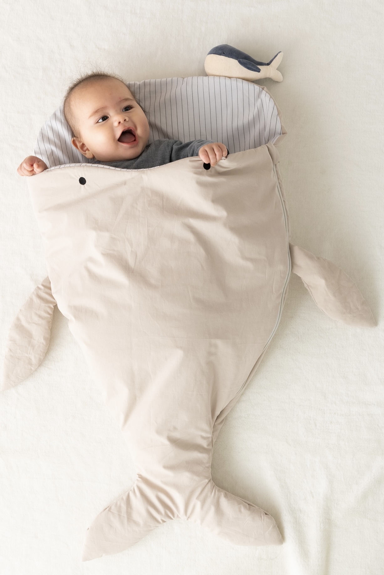 やさしい色味とつぶらな瞳のくじらの寝袋。