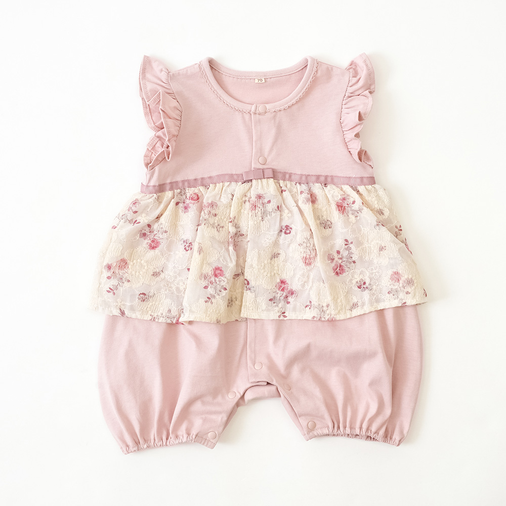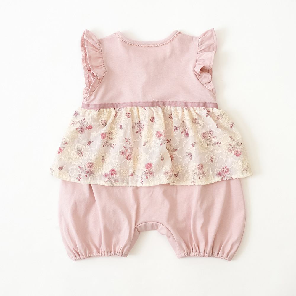 フラワープリントに刺繍を施したベビーロンパース。