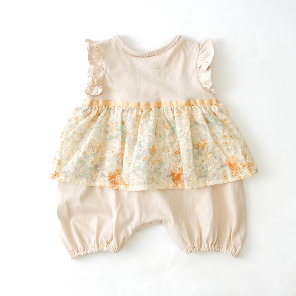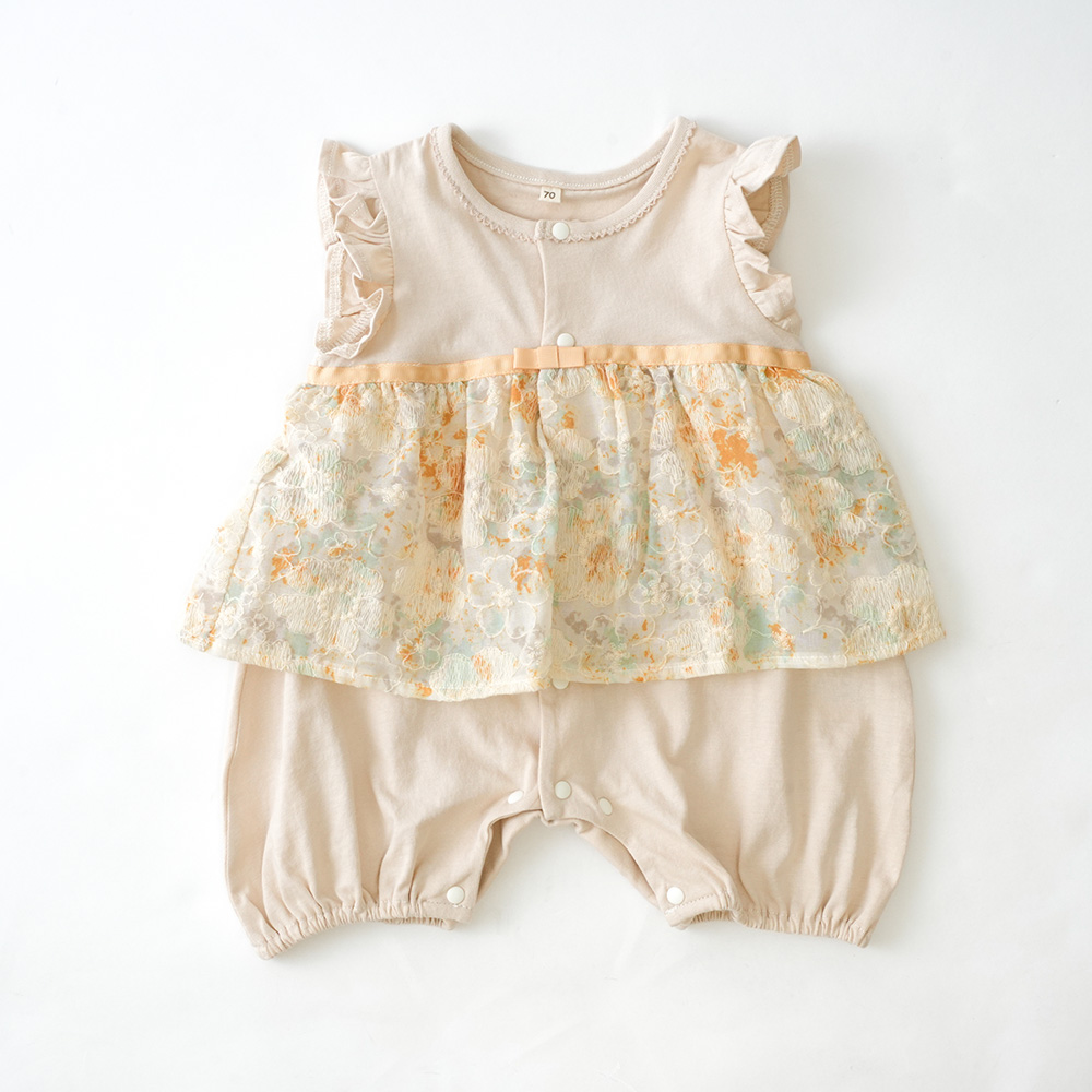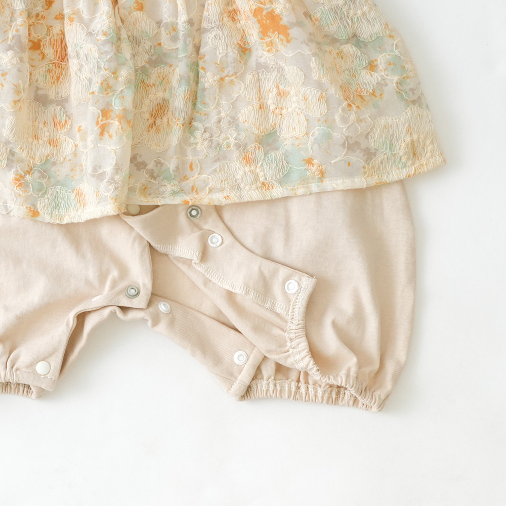 フラワープリントに刺繍を施したベビーロンパース。