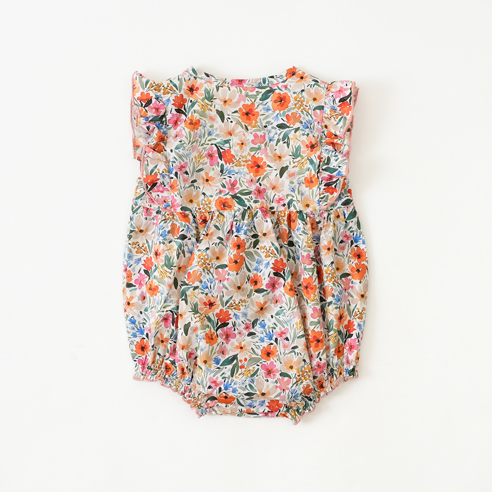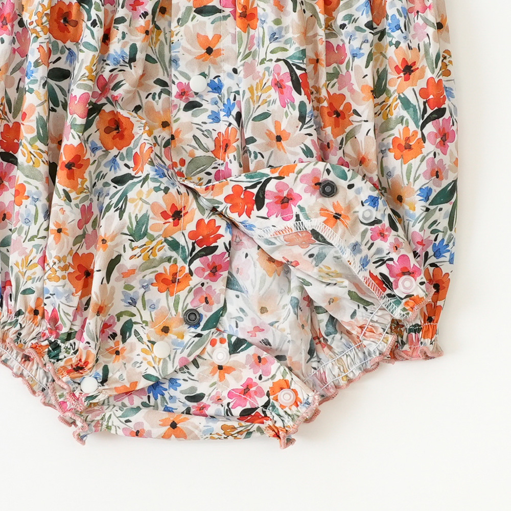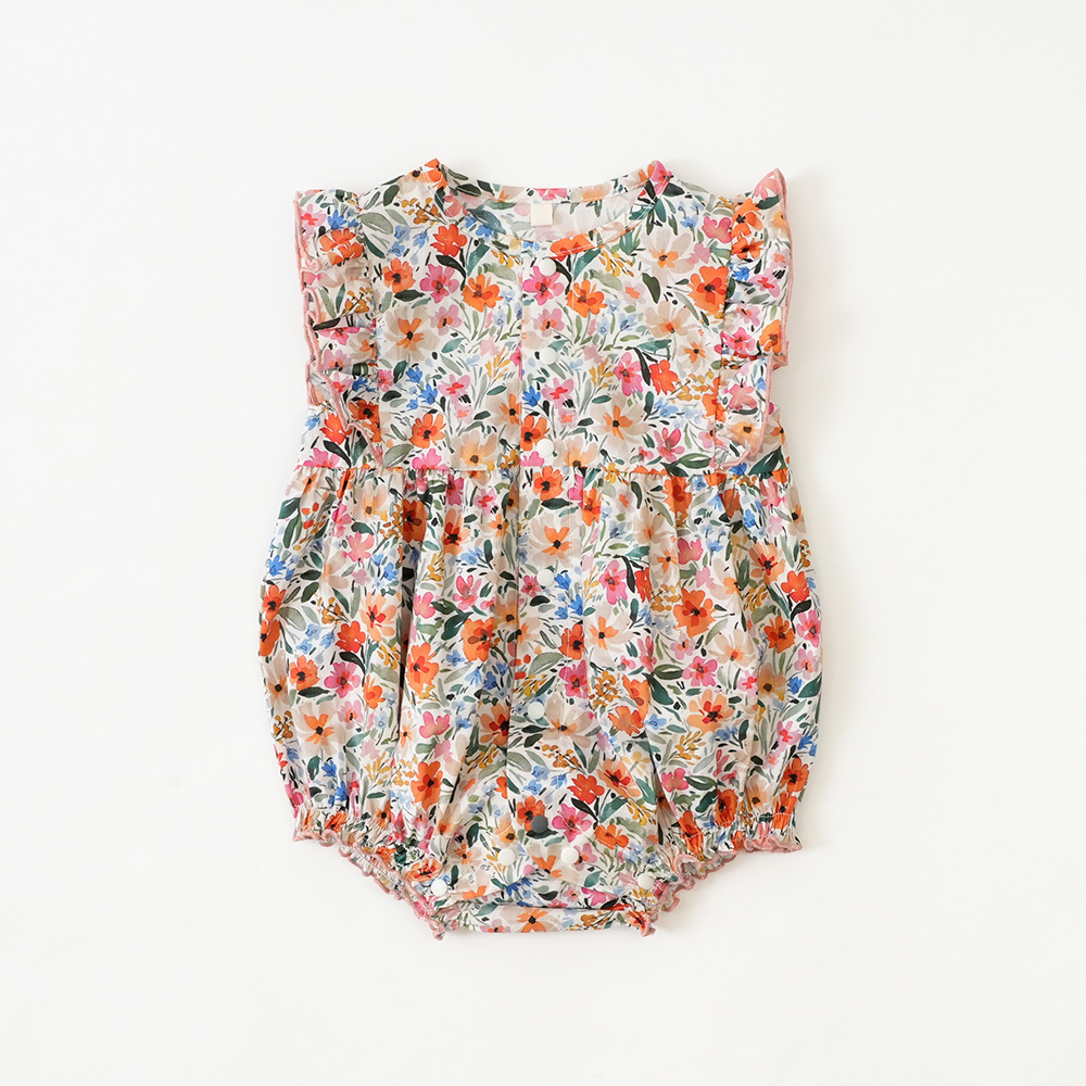 肩のフリルが赤ちゃんの可愛さを引き立ててくれるロンパース。