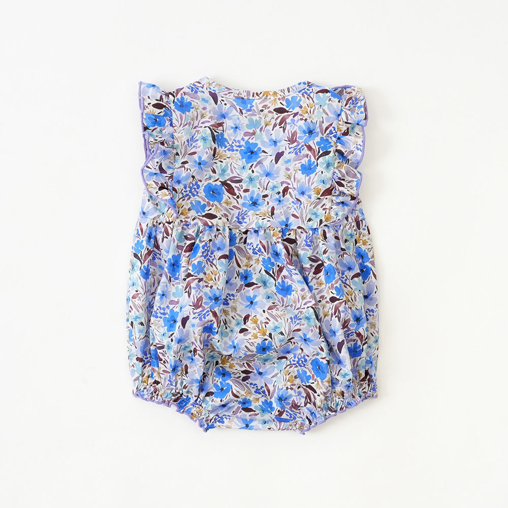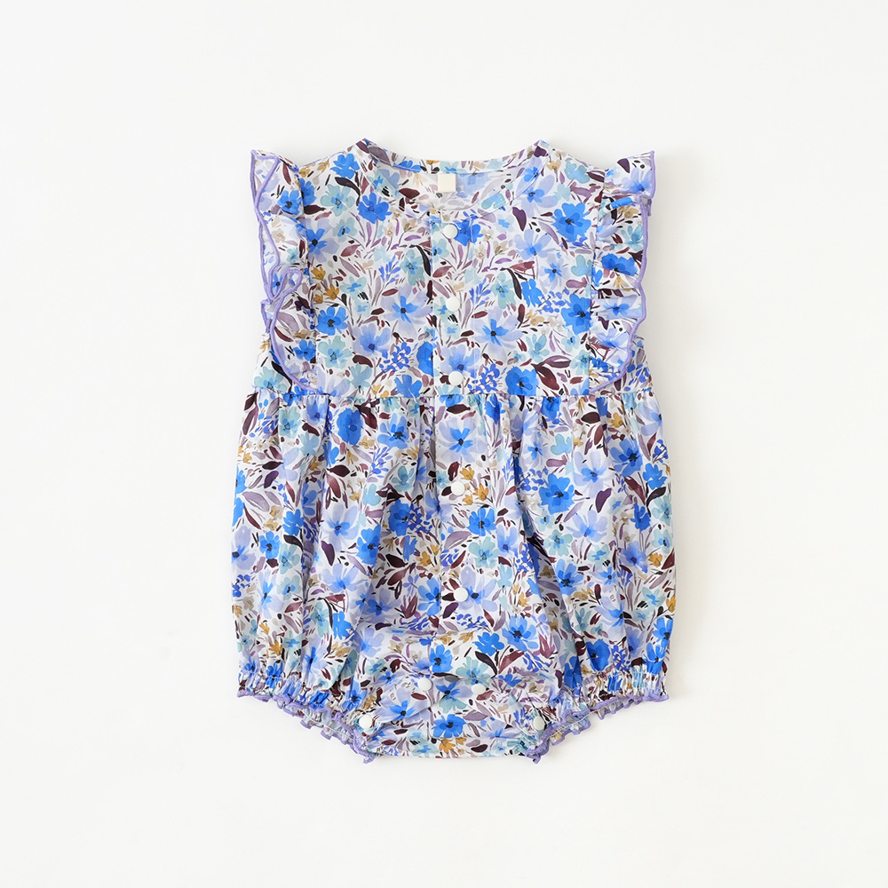 肩のフリルが赤ちゃんの可愛さを引き立ててくれるロンパース。
