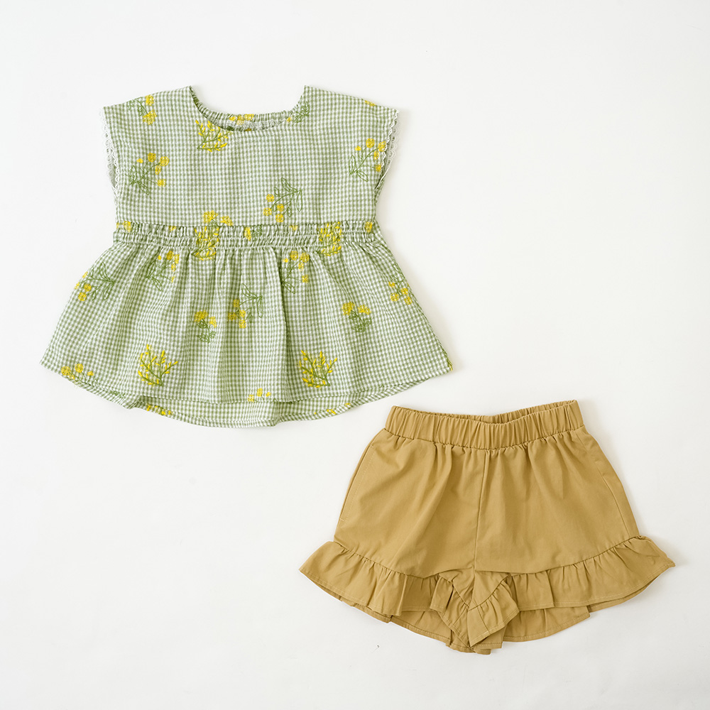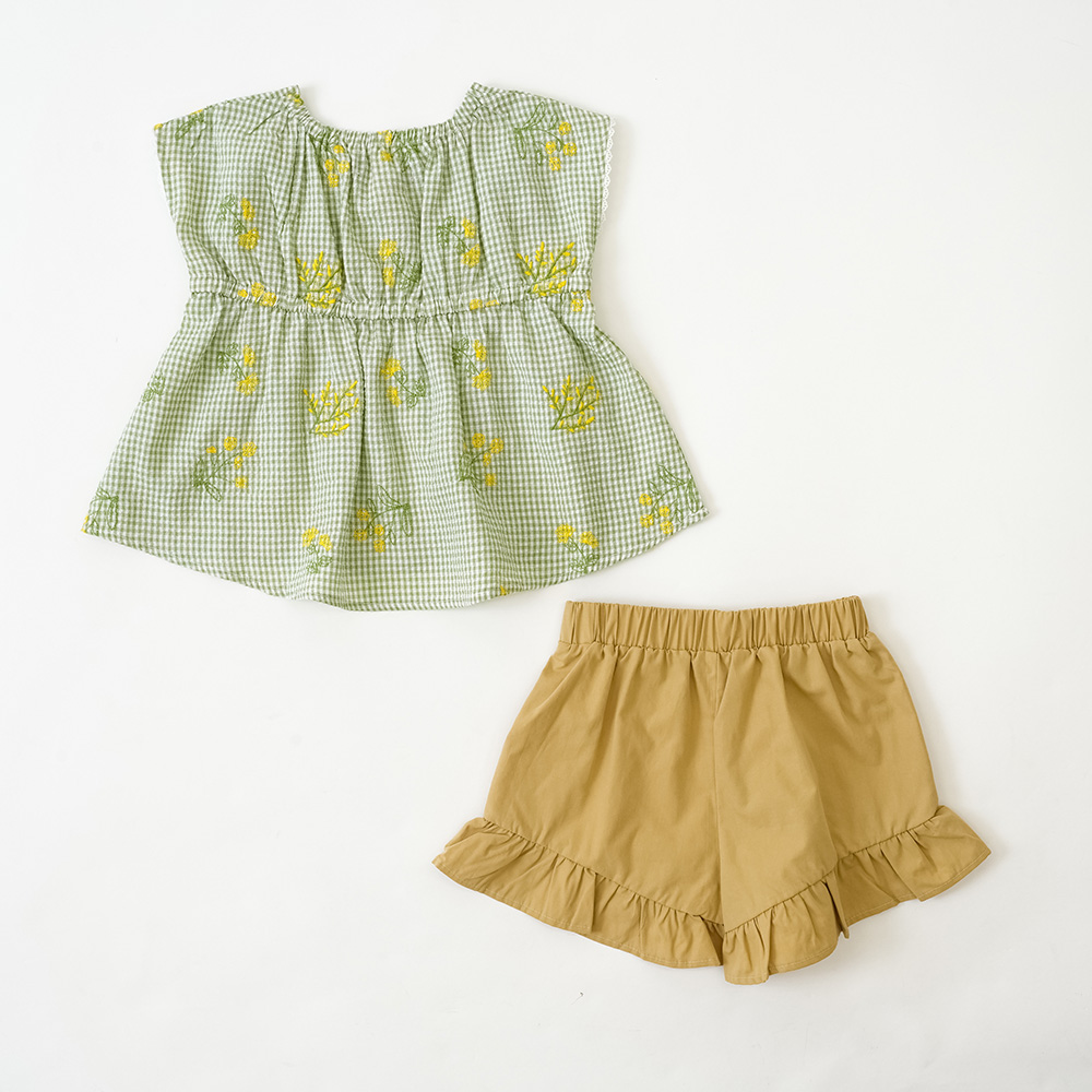 清涼感のあるサッカーチェック素材と、涼しげなカラーリングを使用したセットアップ。