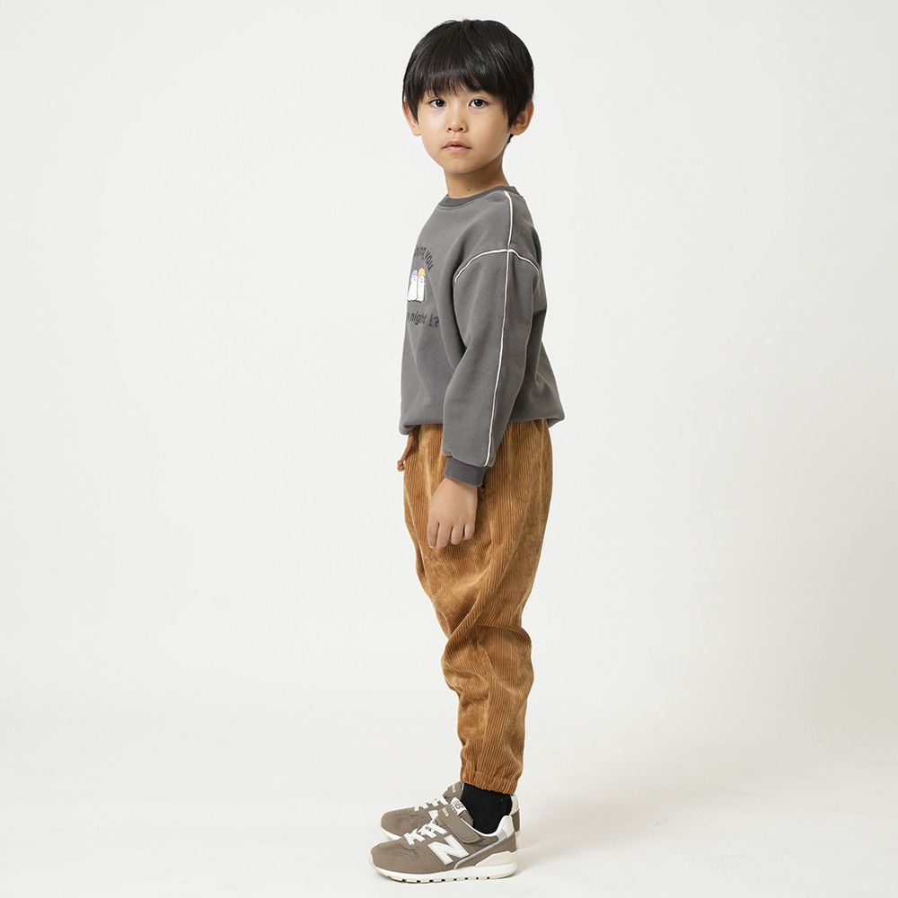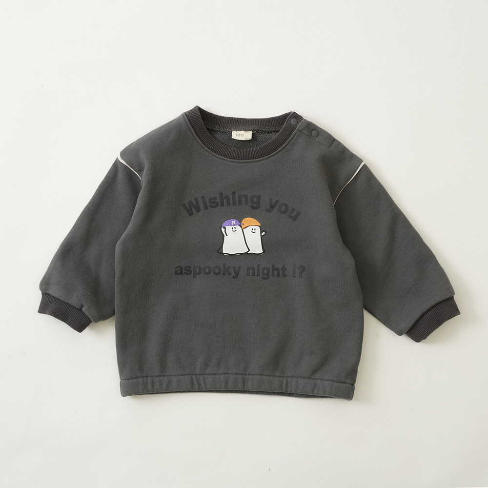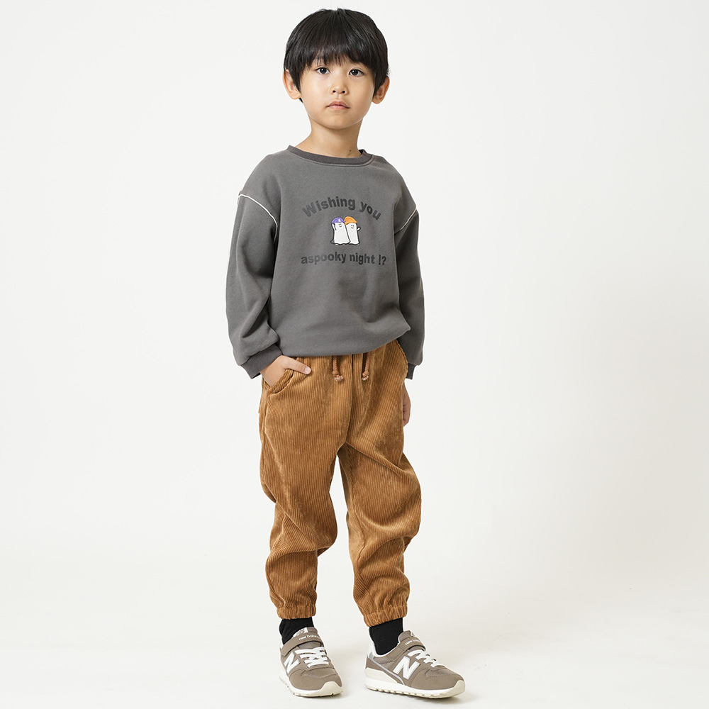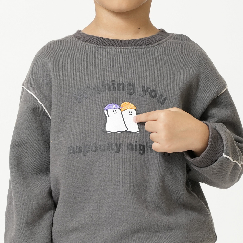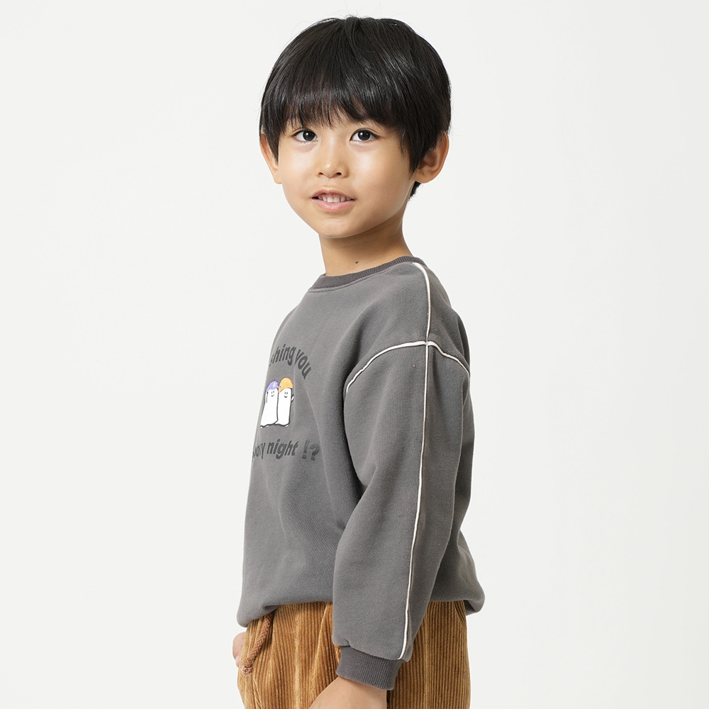 プリント+刺繍でアクセントの効いたかわいいおばけトレーナー!裾にゴムが入って丸いシルエット。ハロウィンにもおすすめです。