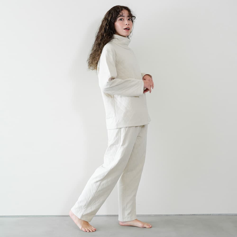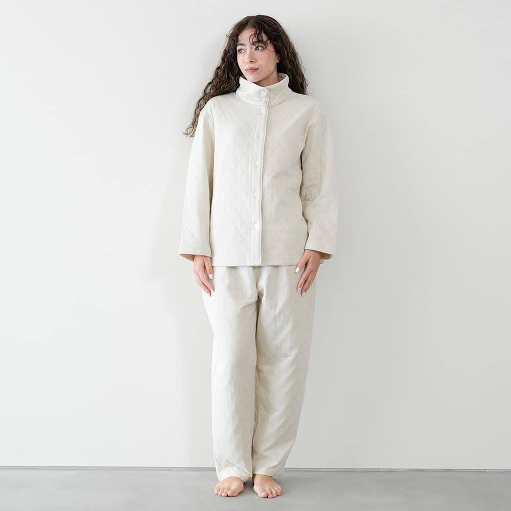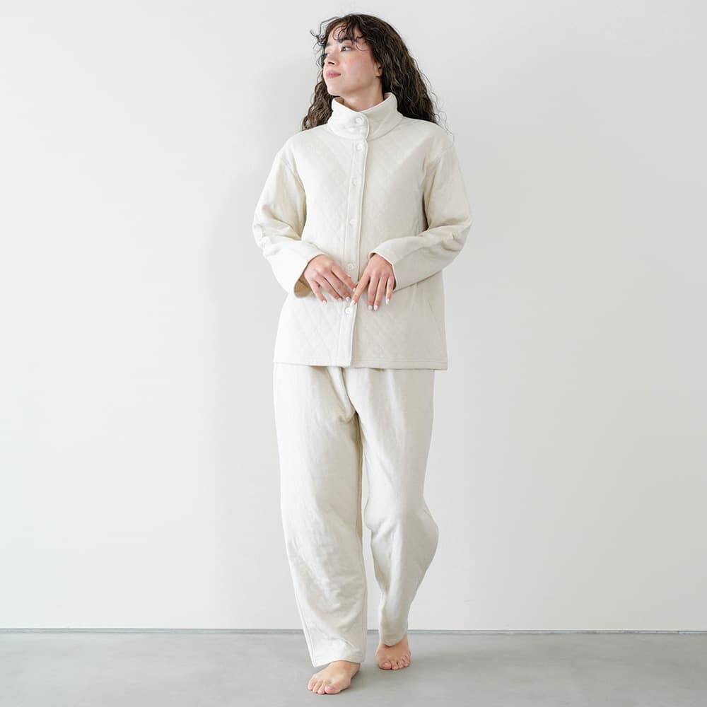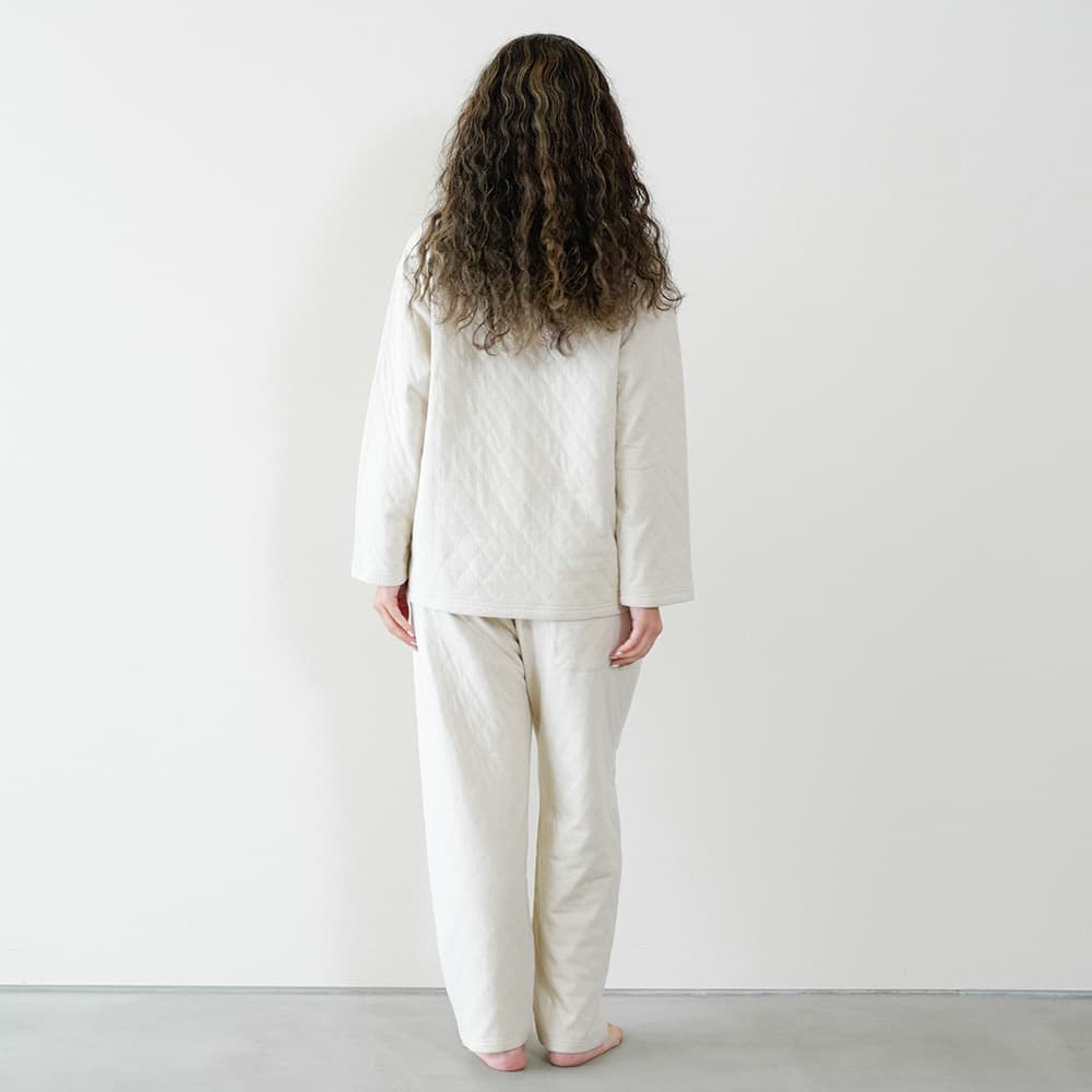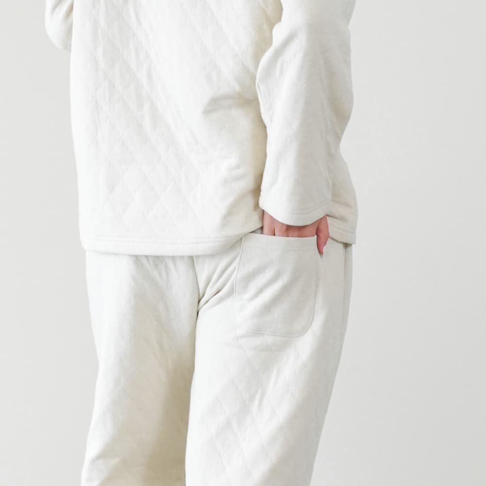 ソフトキルト素材であたたかな着心地です。ボトムは右後ろにポケットがあり、腹巻付きです。