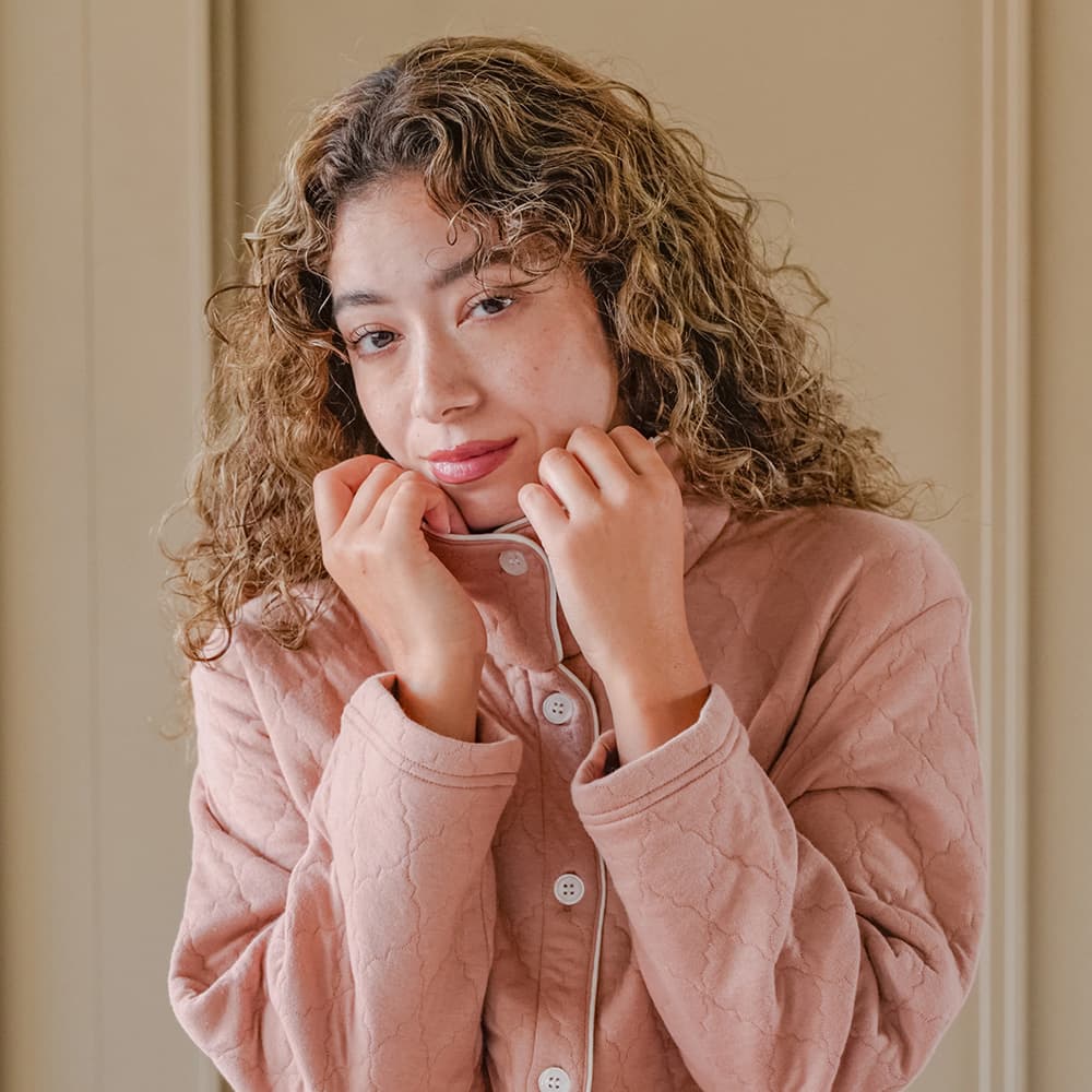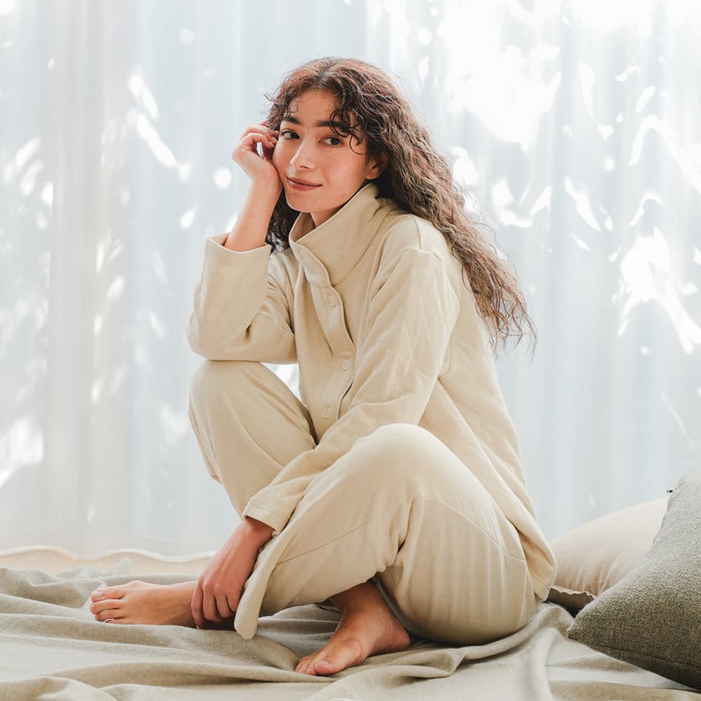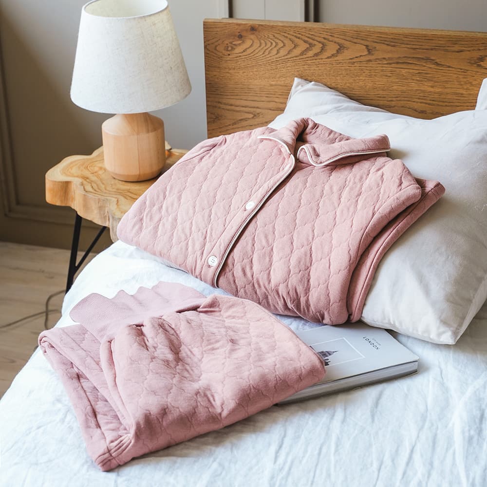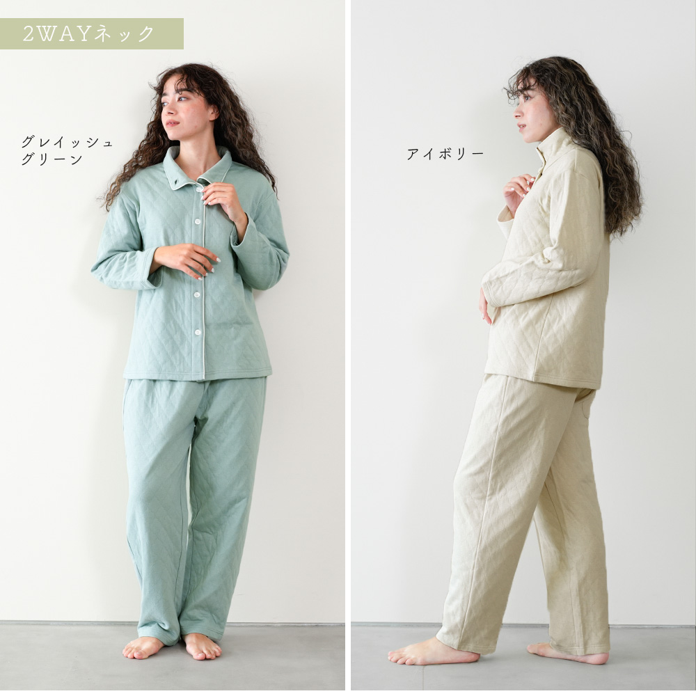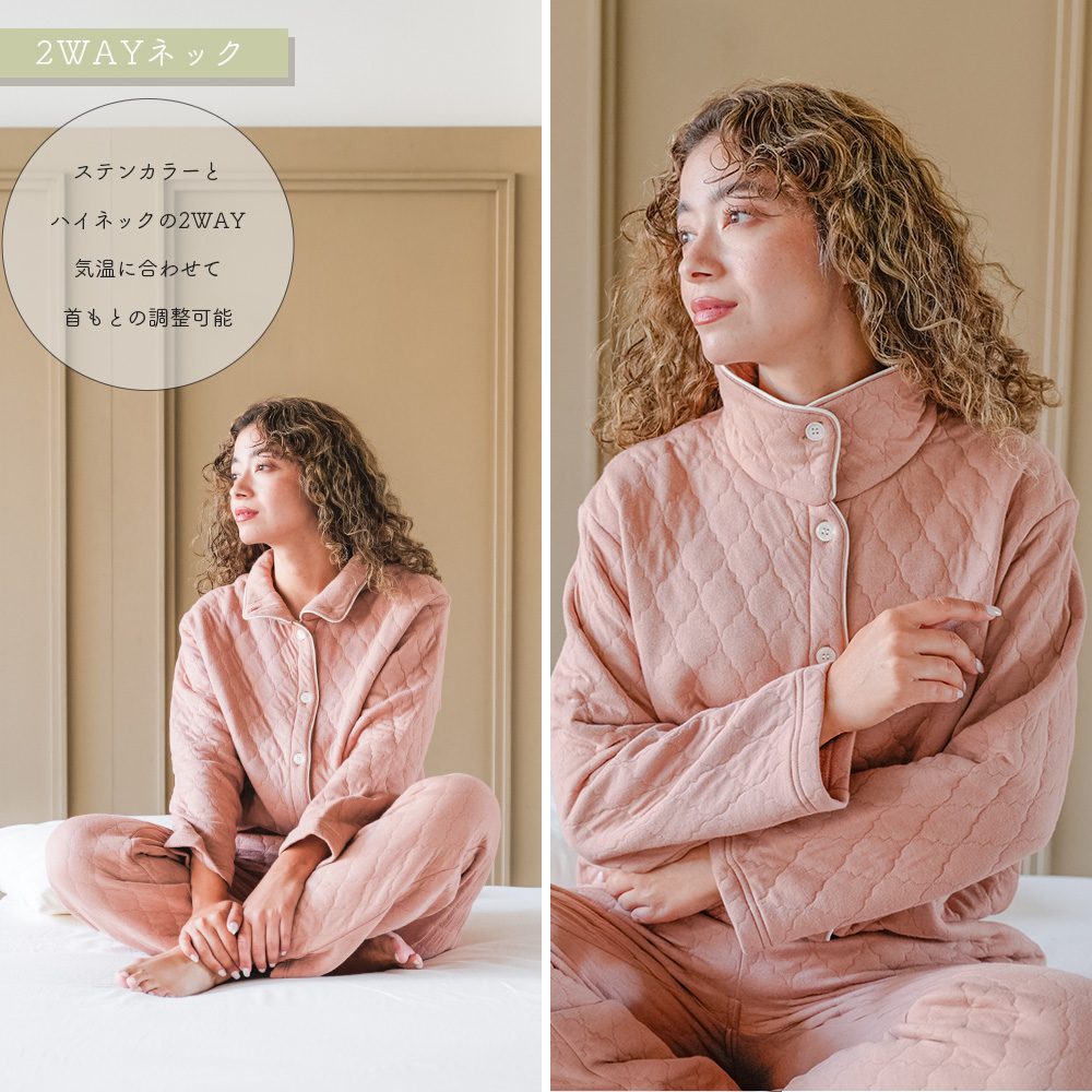ソフトキルト素材であたたかな着心地です。ボトムは右後ろにポケットがあり、腹巻付きです。