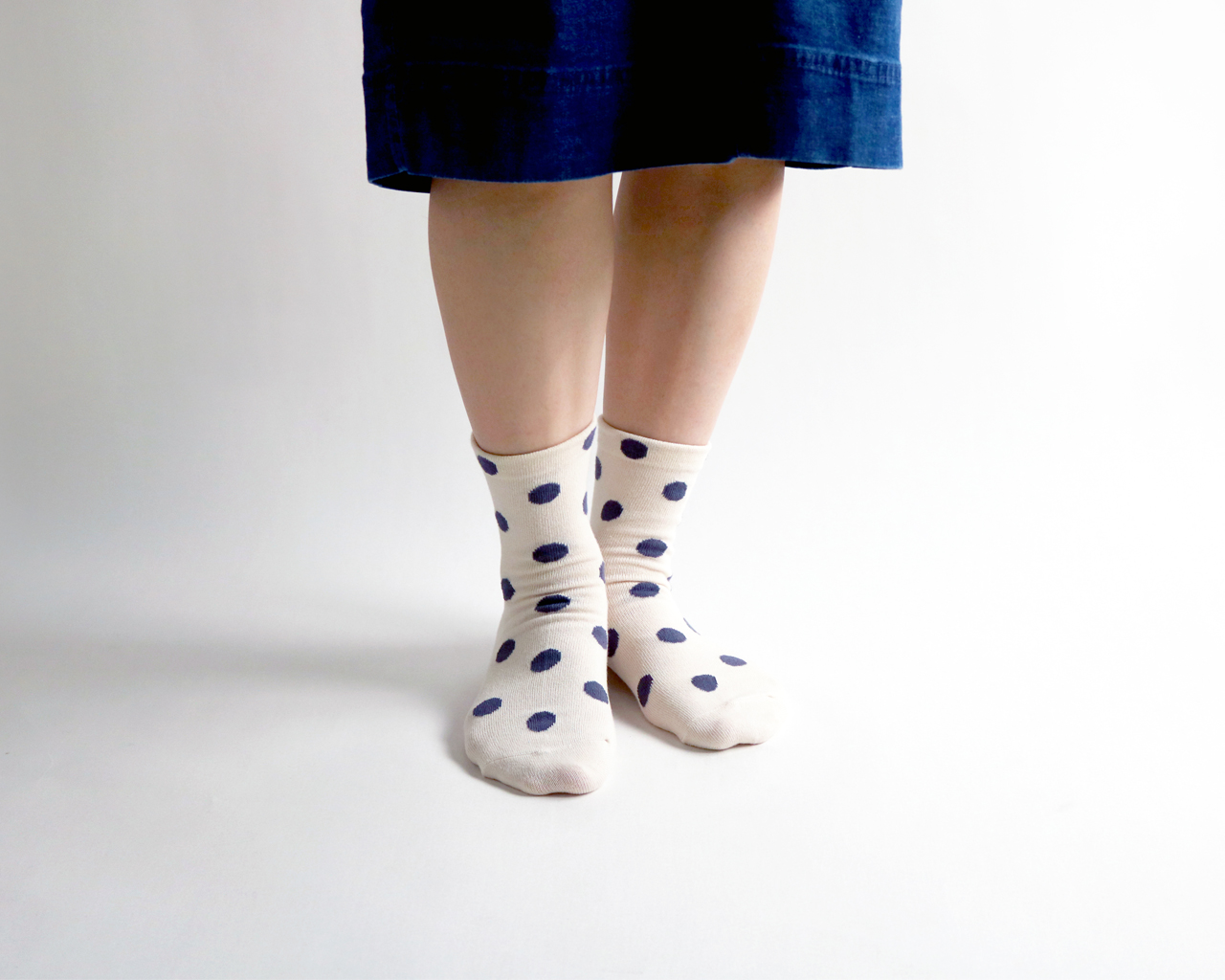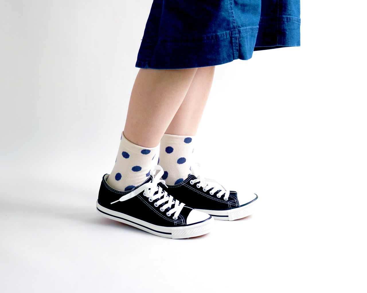 子供っぽく見えがちなドットを優しい色合いで表現することで