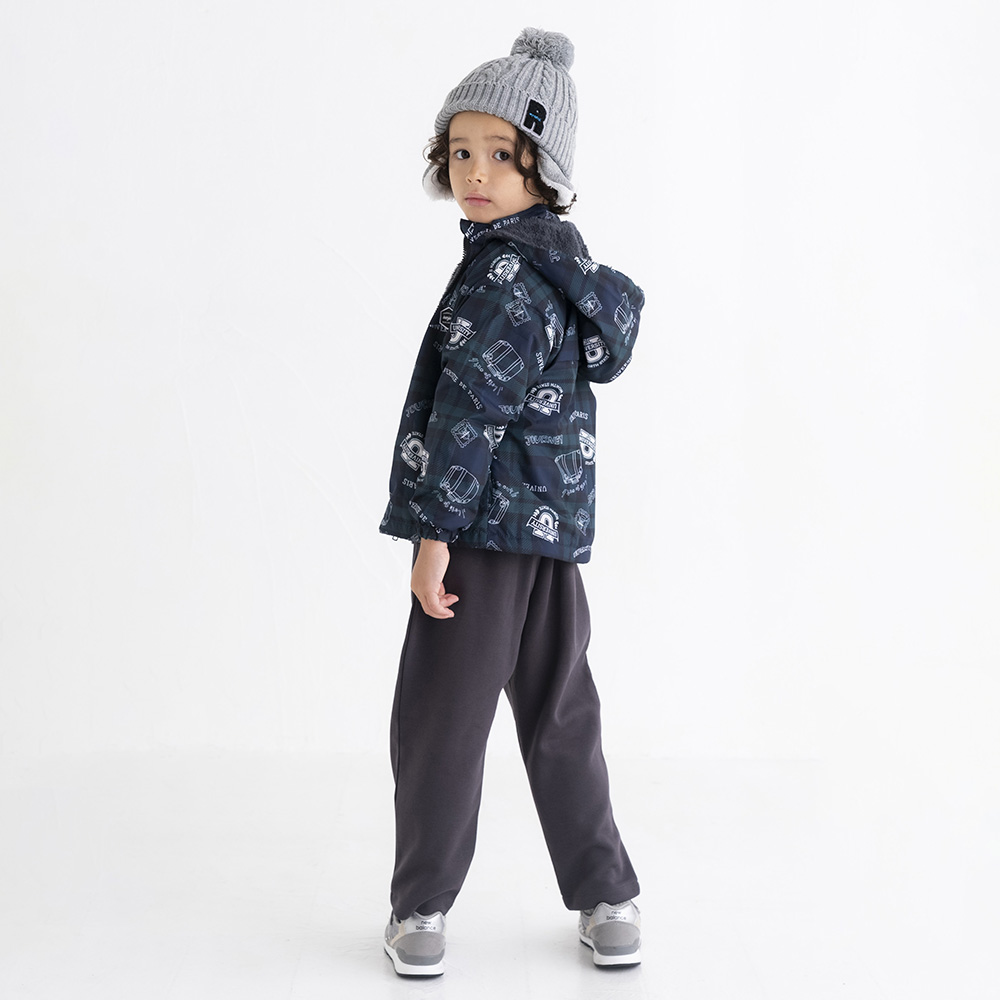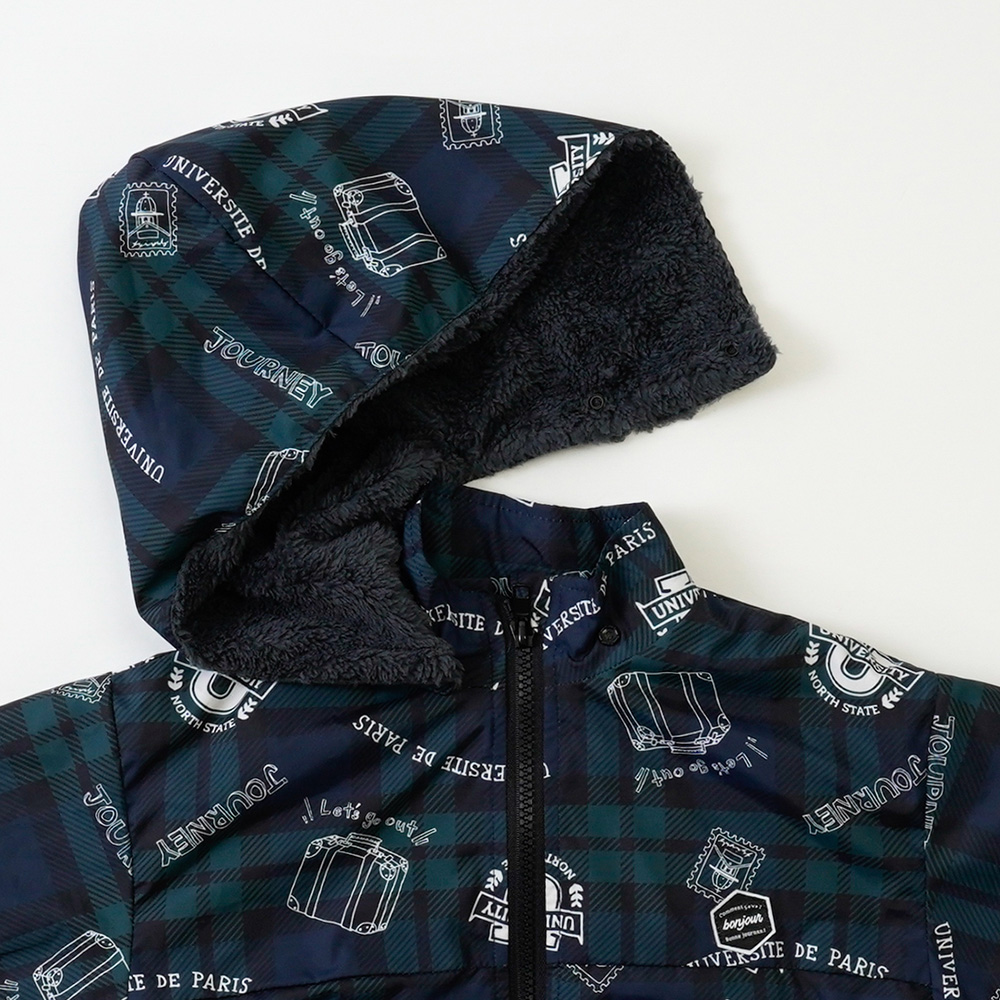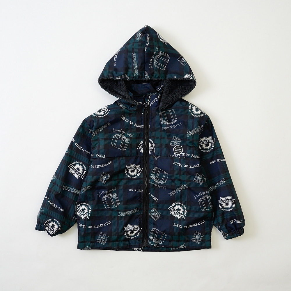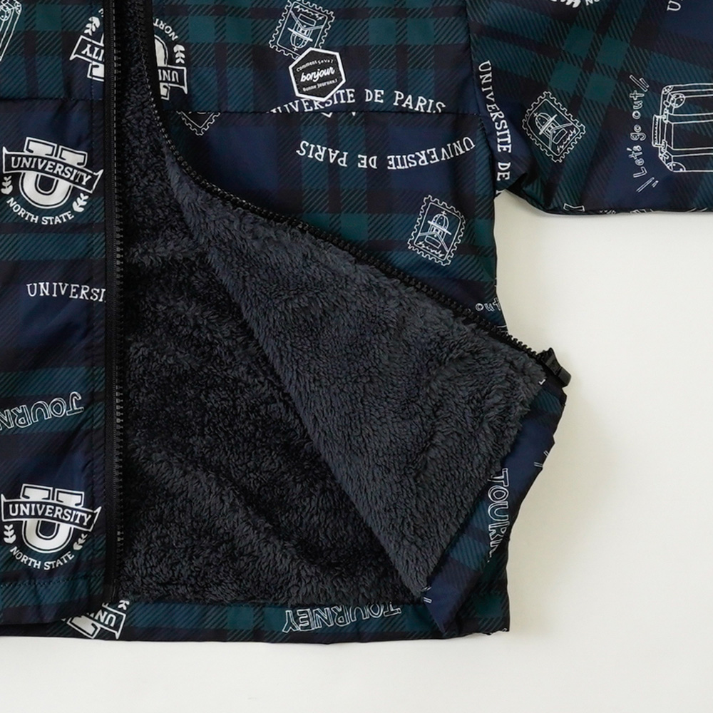 トラッドなチェック柄をベースに手書き風の柄とフラッグ柄の2色展開。裏地は薄手のボアファーになってます。
