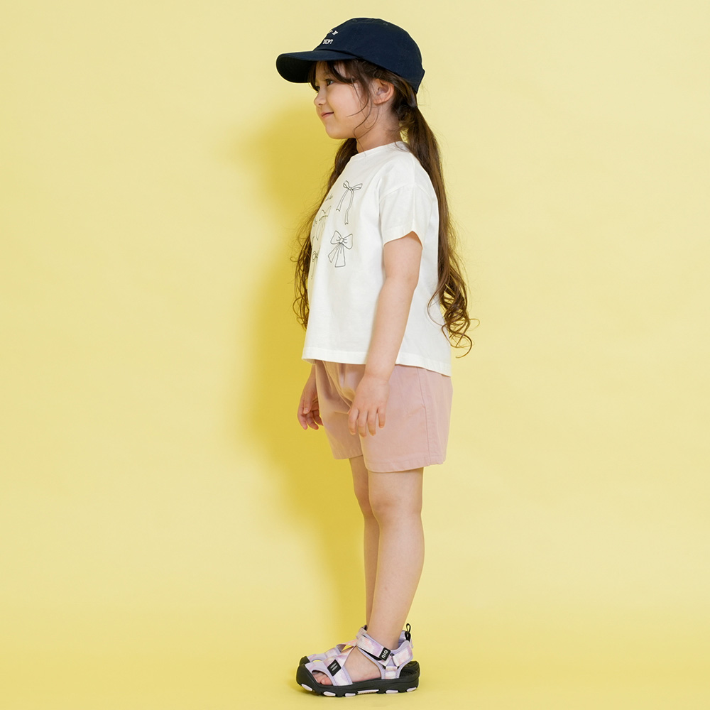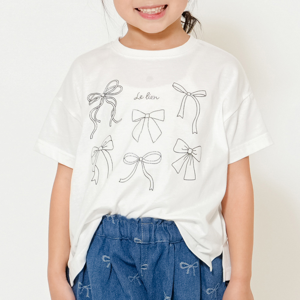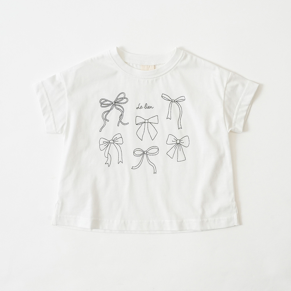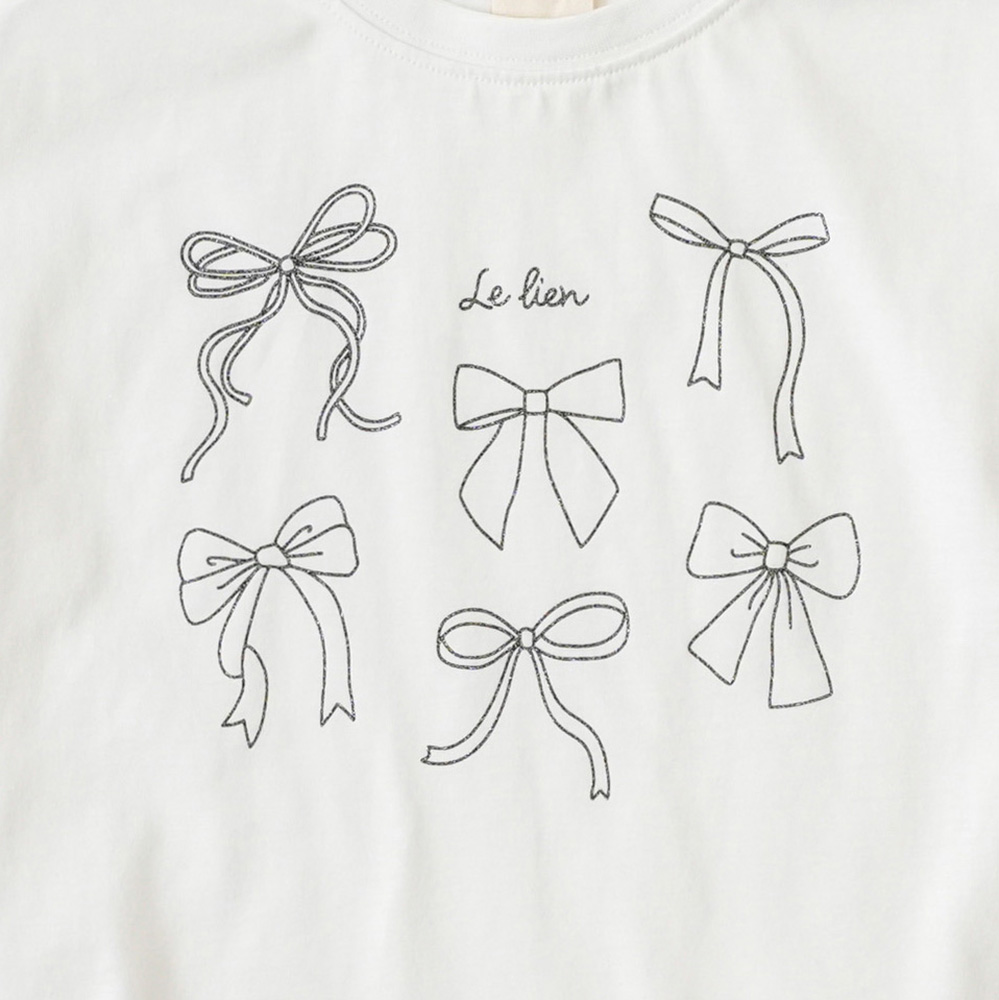 手書き風リボンのイラストがポイントのTシャツはゆったりシルエットにミニ袖が可愛い◎
