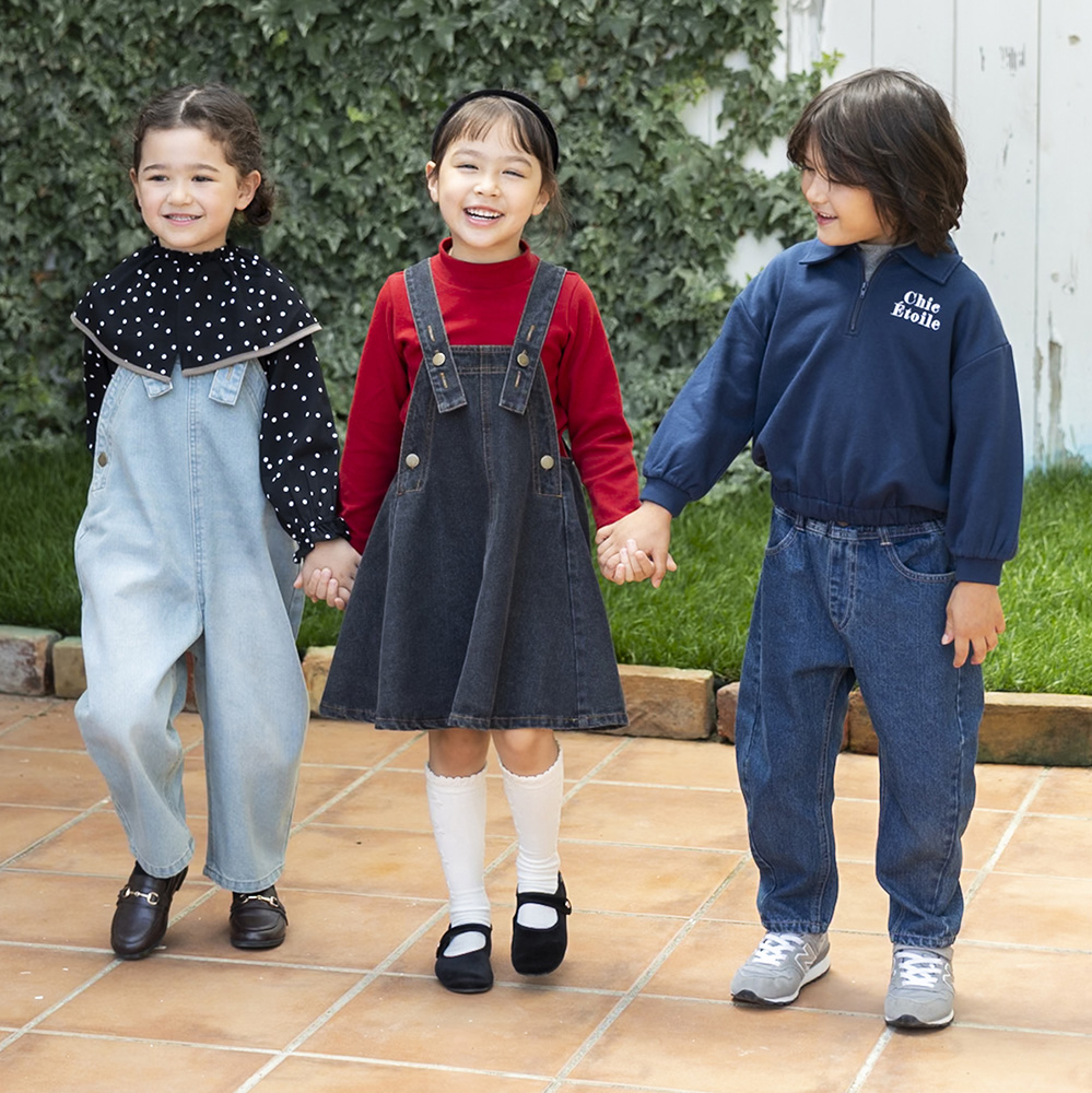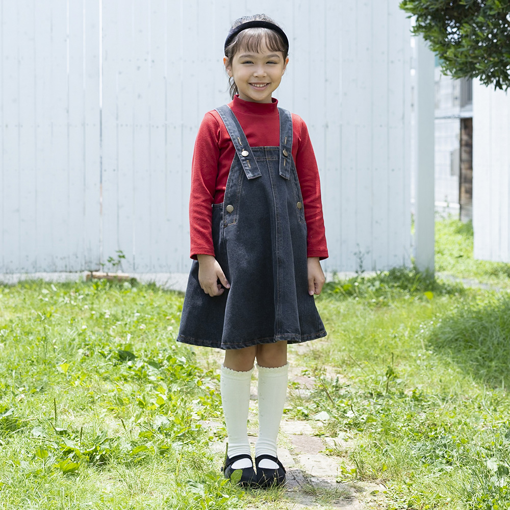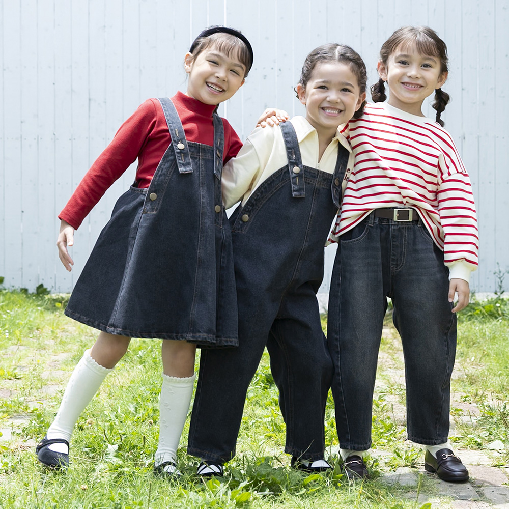 デニムと季節感あるコーデュロイ素材を展開。肩紐は調節可能で、成長に合わせてぴったりフィットします。