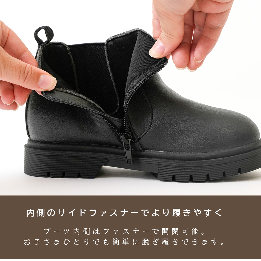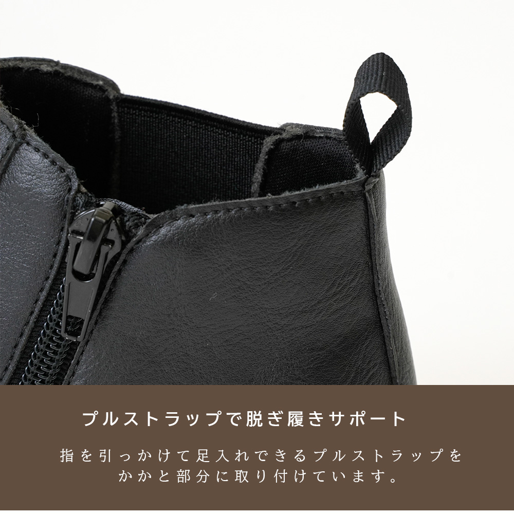 履き口外側は伸縮性のあるゴム素材、内側はファスナーで開閉できるので、お子さまひとりでも簡単に脱ぎ履きできます。 また、かかと部分には指を引っかけて足入れできるプルストラップが付いているので、スムーズに脱着できます。